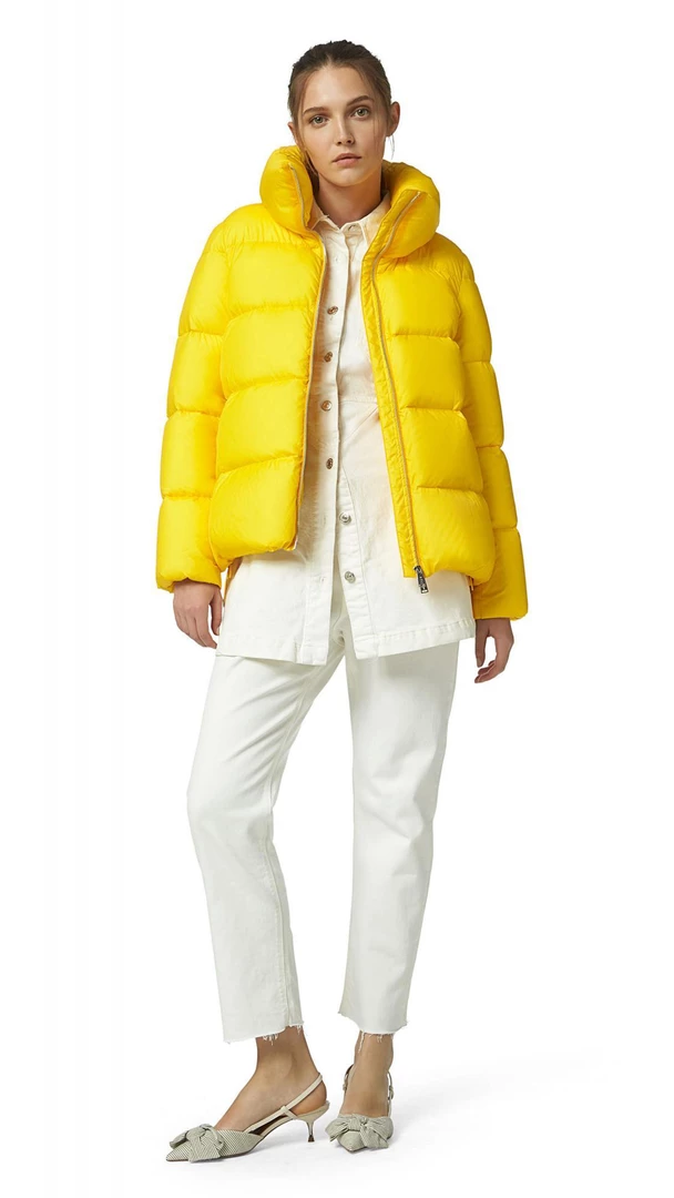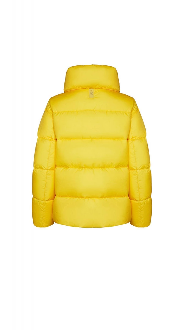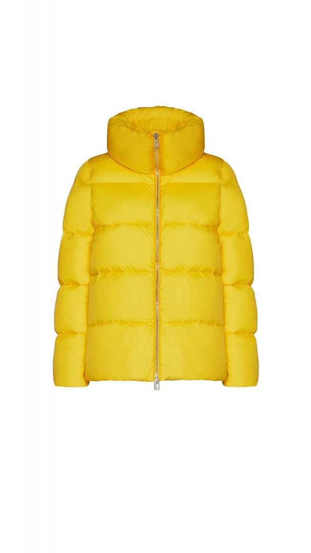 A classic cape reinterpreted with a sporty influence. This quilted down Jacket is slightly flared at the hem and has a high collar. A boxy volume and a glossy look that fits perfectly into the dynamism of city life.