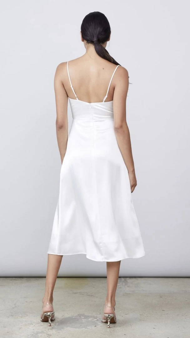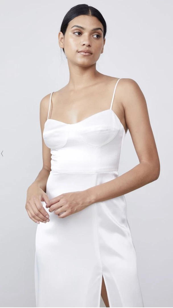 A bustier bodice and thigh-high slit bring a sexy edge to this elegant midi dress, made with sustainable Luxe Satin. Available online only.Â