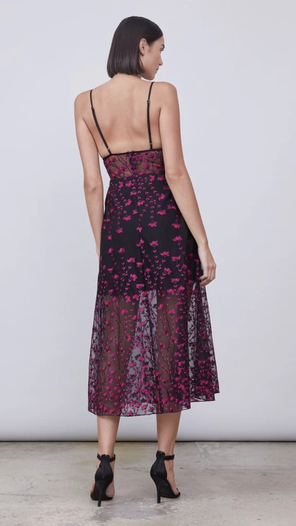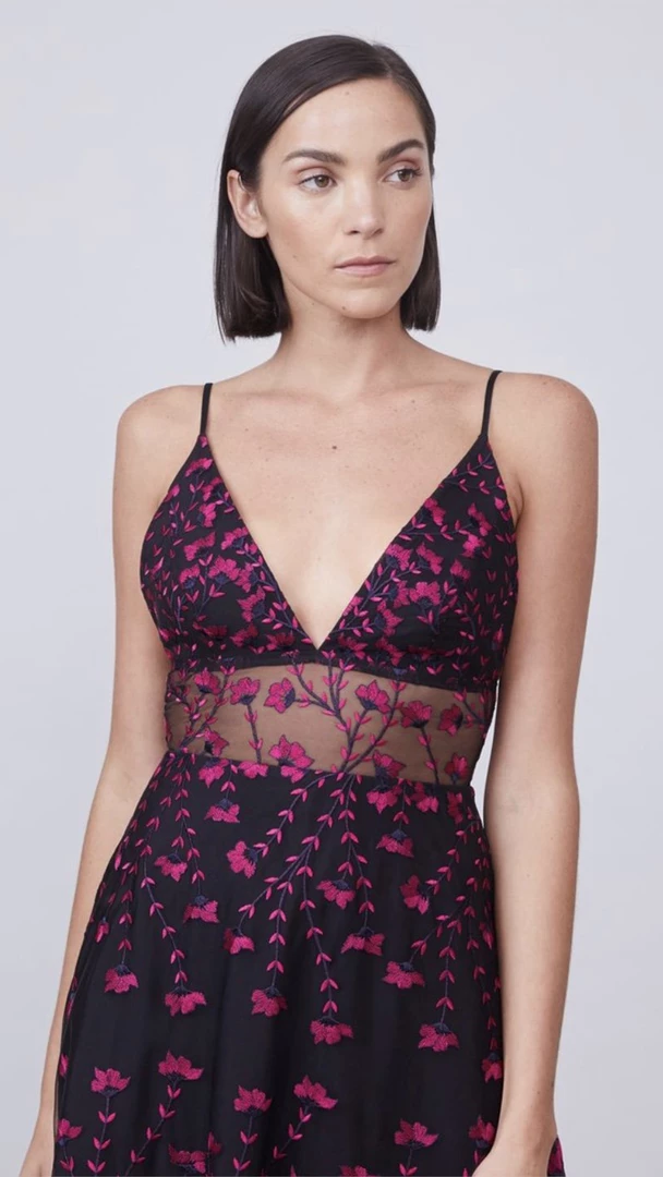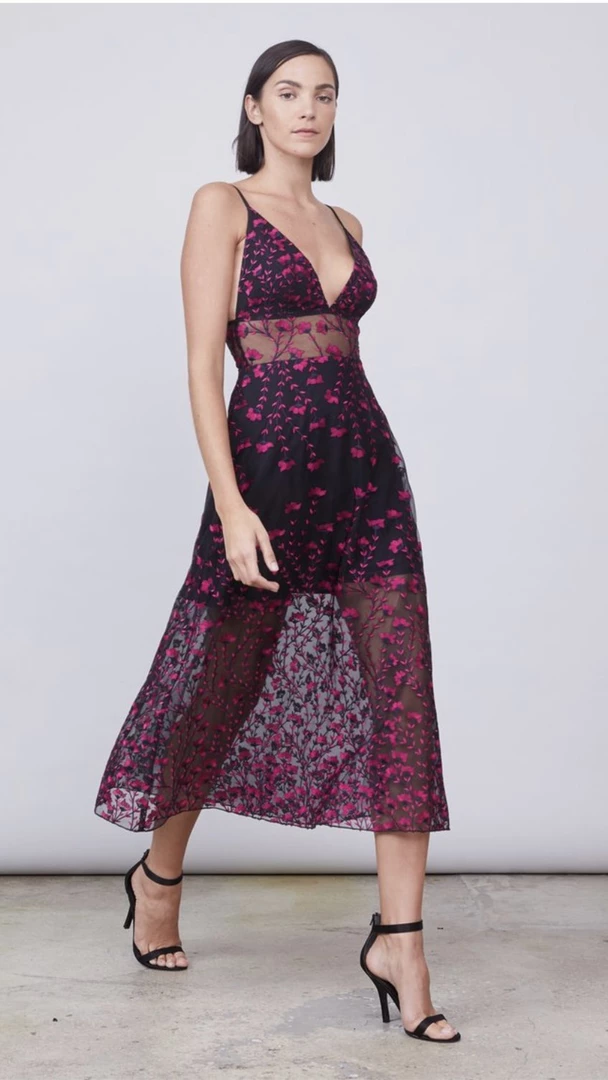 Allen Schwartz modern take on an evening gown complete with a floral print and mesh details. This v-neck midi dress is the perfect ensemble for the upcoming season.