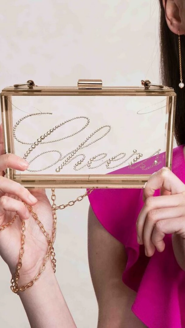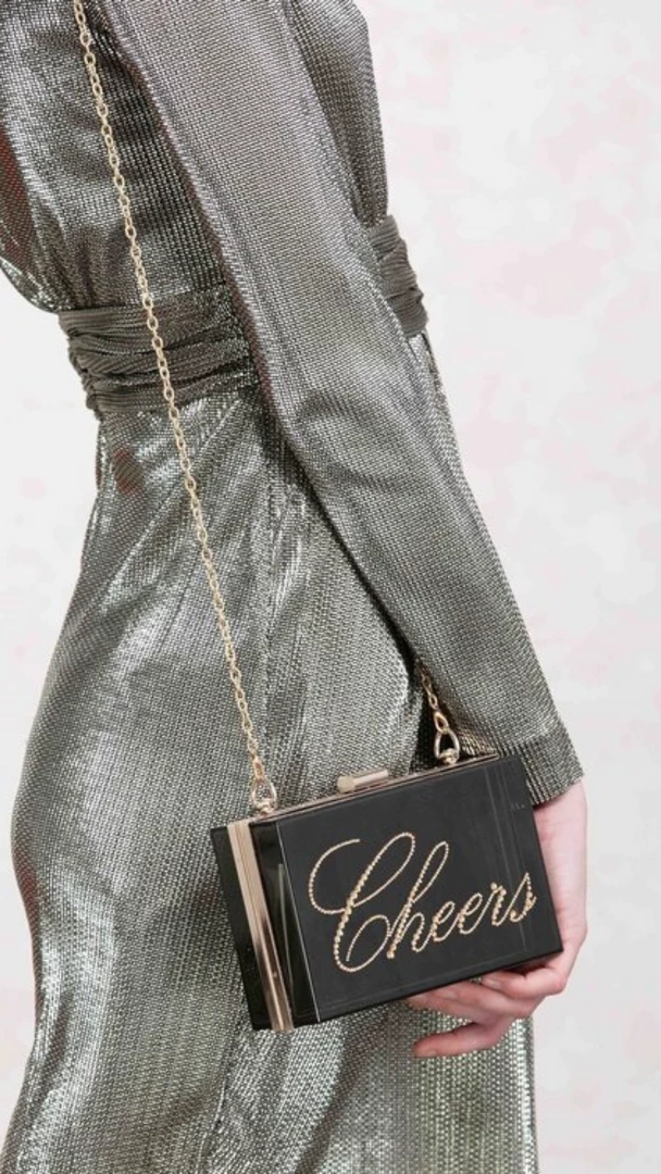 This modern lucite clutch features the word “cheers” written on the front of the bag in large, cursive lettering. The text is placed across the center in dazzling Swarovski crystals that stand out on this clear plastic clutch. It is fashioned out of strong, yet lightweight metal with a rectangular frame that peeks out along the border of the clutch, which measures 7 inches in length by 4 inches in height.