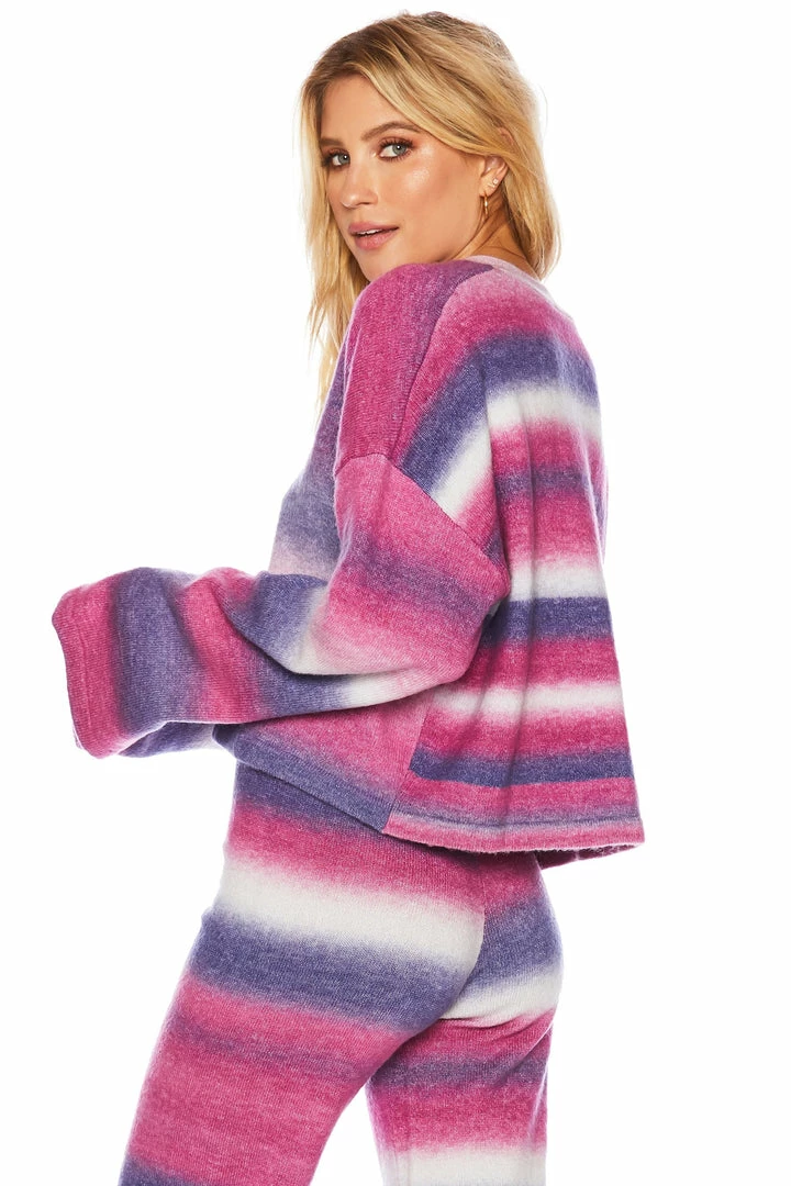 The Judith Top is our button up cardigan sweater with bell sleeves now in our Royal Rouge stripe. Pair this with the Ramona Pant to make it a chic set.