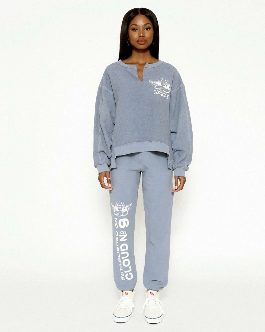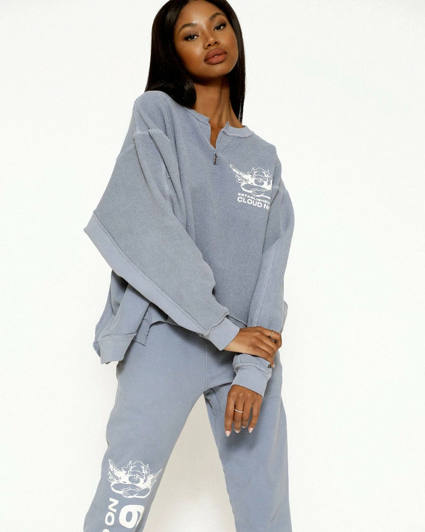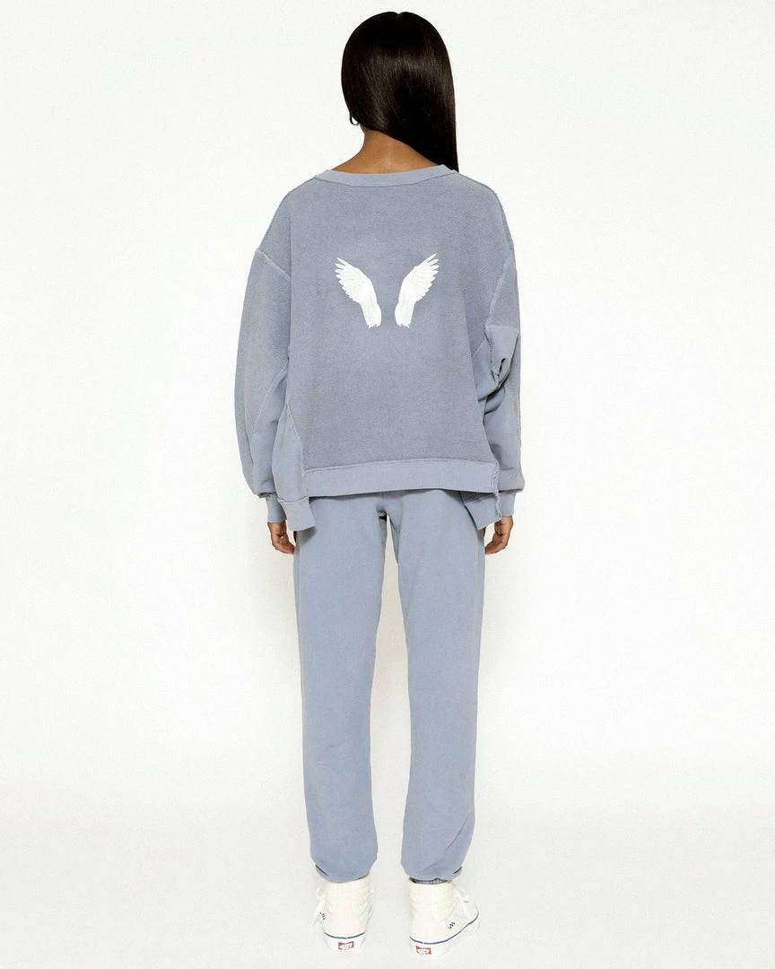 Lightweight cotton/spandex French terry. Oversized textured crewneck with inside-out seam details, V cut detail, and uneven hemline.