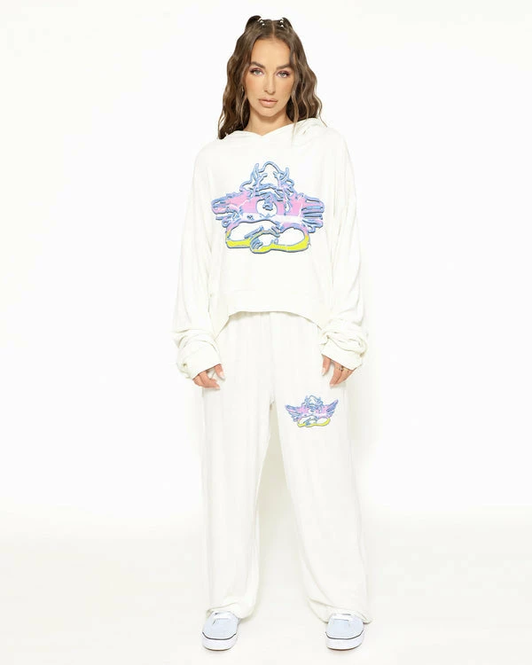 Lightweight terry cloth fabric in off white. Oversized fit with ribbed edges, a dramatic hood, slightly cropped hemline, and front pocket. Washed for a vintage look and feel.