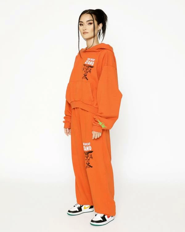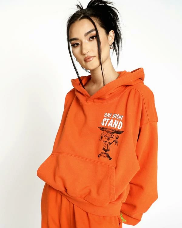 Heavyweight french terry. Oversized cropped hoodie featuring a dramatic hood, front pocket, and slightly curved front hem.