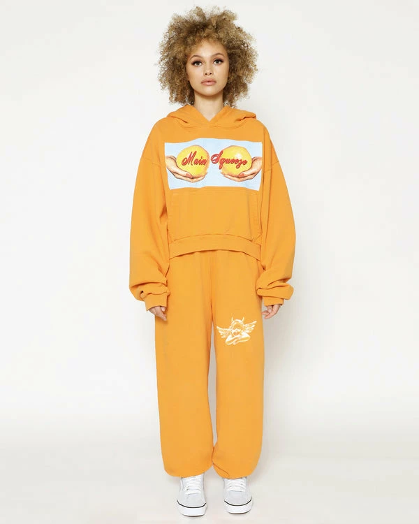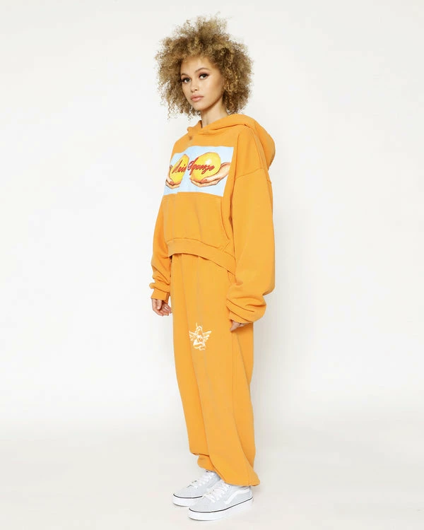 Heavyweight french terry. Oversized cropped hoodie featuring a dramatic hood, front pocket, and slightly curved front hem.