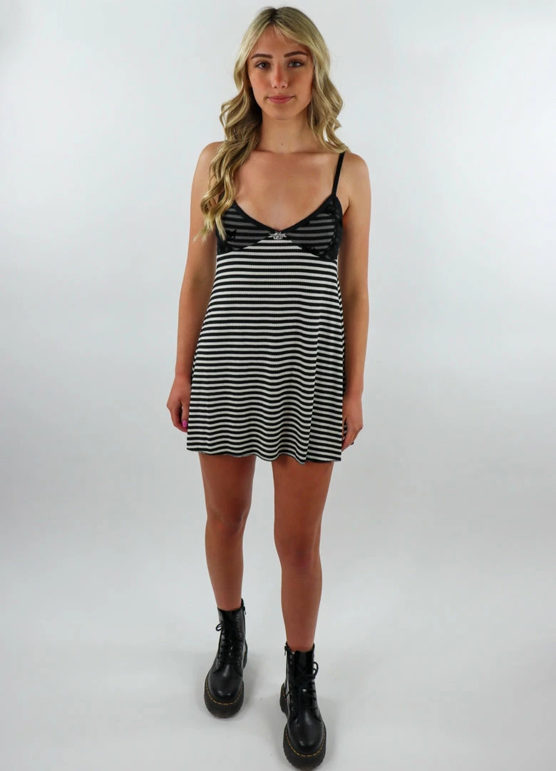 Soft and stretchy two by one rib knit. Striped body with a flocked mesh overlay. Bustier seam details. Custom Boys Lie alloy angel piece and adjustable straps.