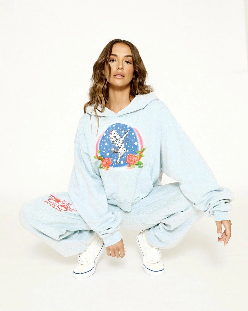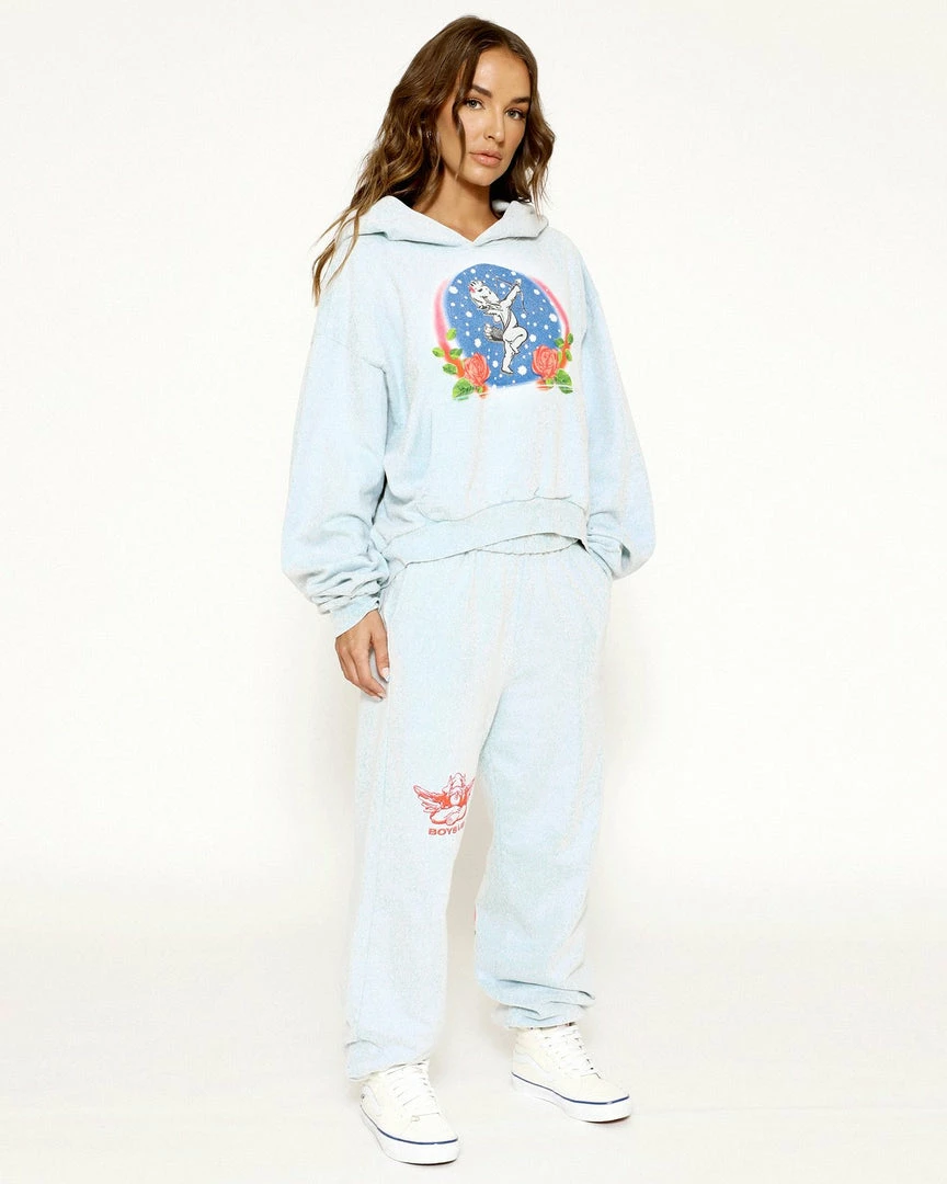 Lightweight fleece. Oversized cropped hoodie featuring a dramatic hood, front pocket, and slightly curved front hem.