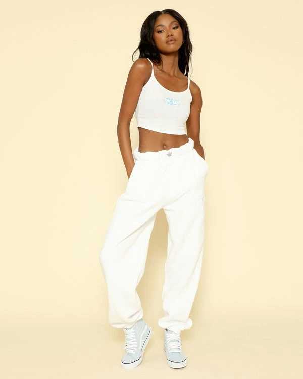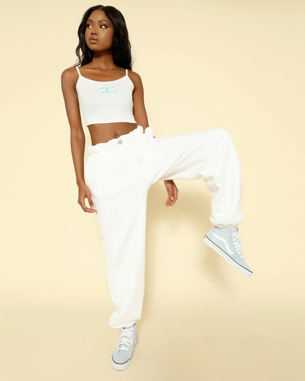 High rise cotton sweatpants with gathered elastic waistband and cuffs. Oversized fit. Silver cherub snap button.