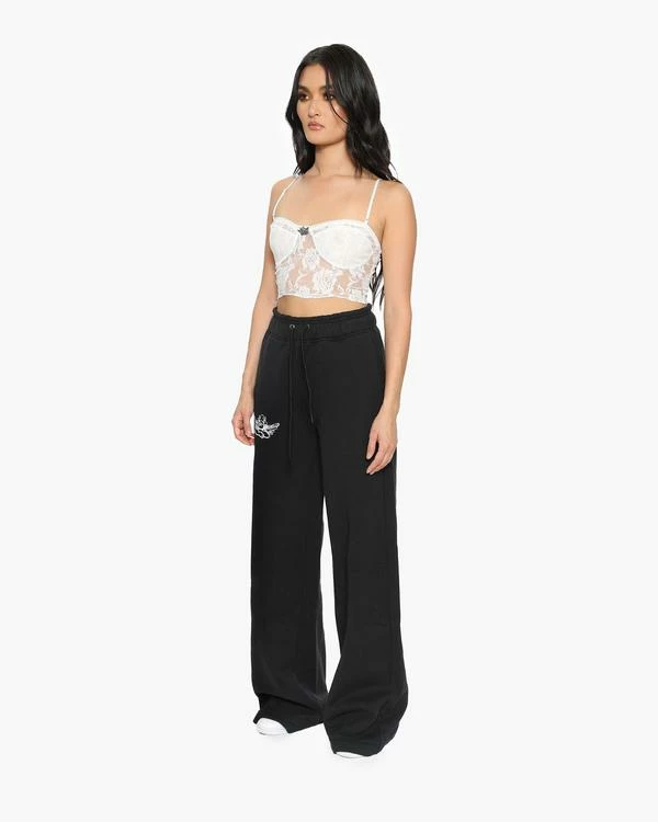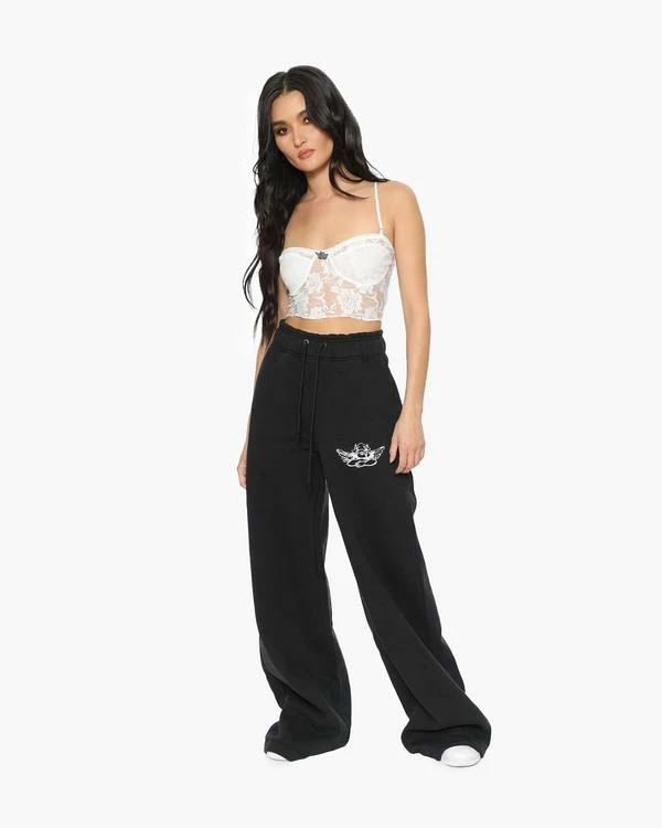 Delicate sheer lace bodice with bustier seam details and cup lining. Features a custom Boys lie angel piece and adjustable straps.