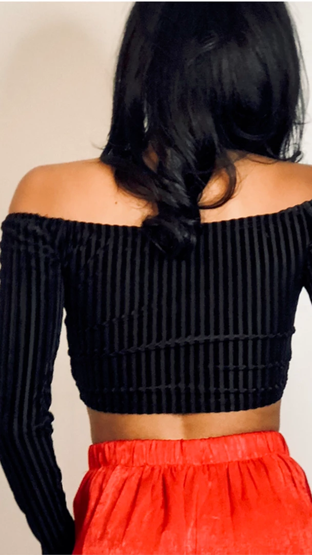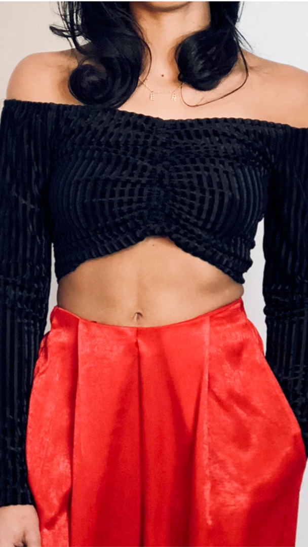 Off shoulder black velvet, long sleeve crop top. Ties can adjust the front length of the top. A versatile top to go with high waisted pants, skirts, shorts, and much more. A staple to any wardrobe.