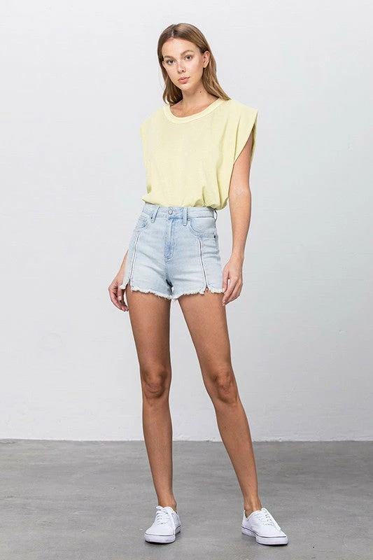 HIGH RISE SHORTS WITH FRONT ZIPPER 98% COTTON, 2% SPANDEX (SIZE S) FRONT RISE 10 1/2" LEG OPENING 22" INSEAM 2 3/4" *Model wears size S*