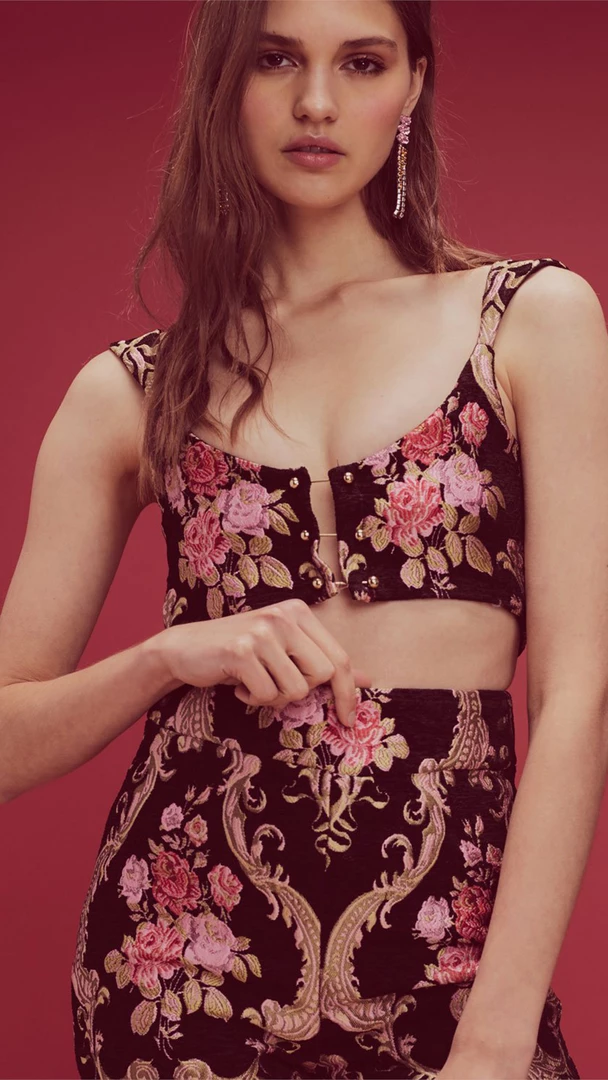 The Brocade Crop Top will elevate any look with its luxe tapestry-like pattern that features gold barbell detailing and an invisible side zipper. Pictured with the Brocade Flared Pant.