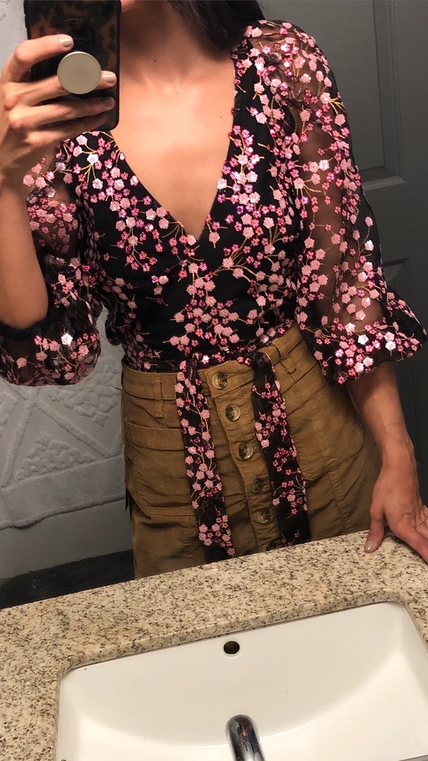 The Gibson Wrap Top – the perfect amount of dramatic. This piece features sequin-embroidered floral tulle with a sheer back and elastic sleeve opening. Pictured with the Billie Vinyl Skirt.