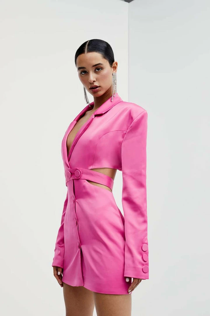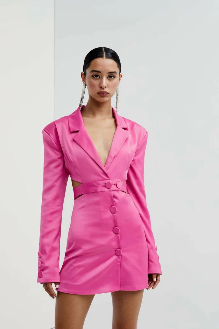 Sleek duchess satin mini blazer dress featuring padded shoulders and sexy waist cut-outs. Tonal buttons, fully lined.