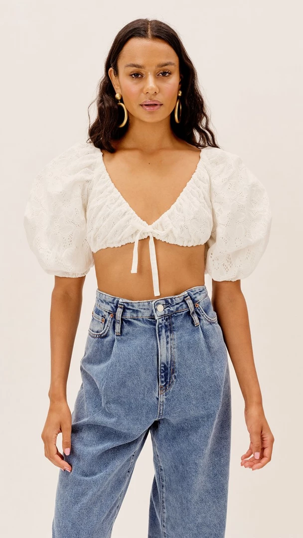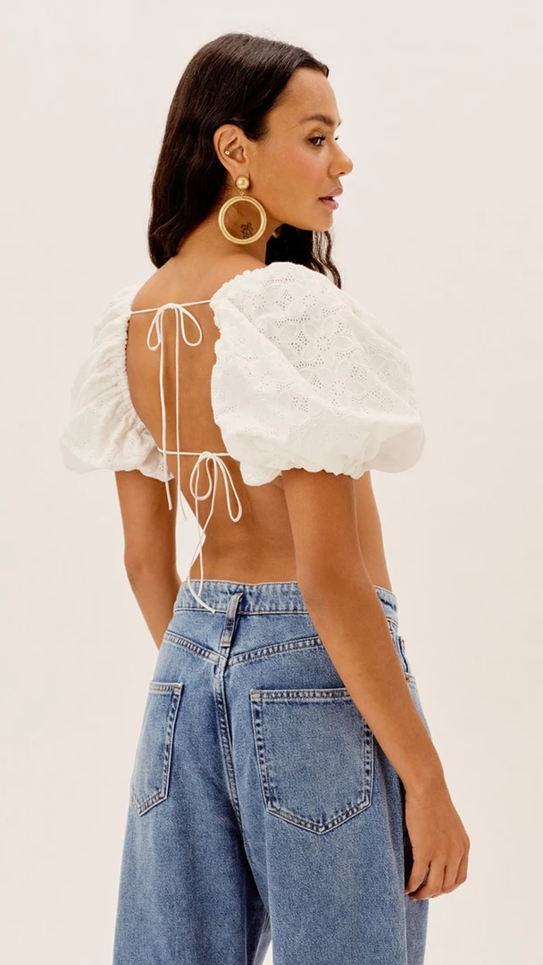 Carefree eyelet crop top featuring dramatic puff sleeves, a free-spirited open back with delicate tie closure, and elastic neckline and bust.
