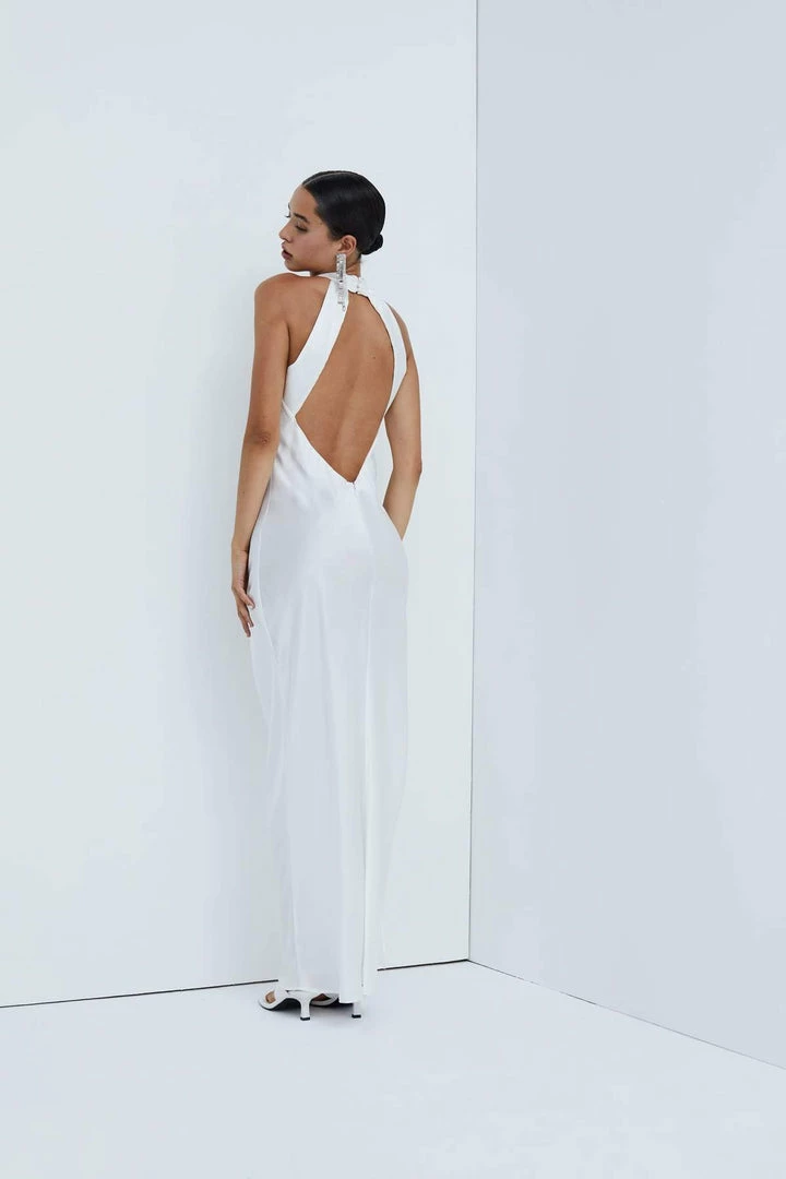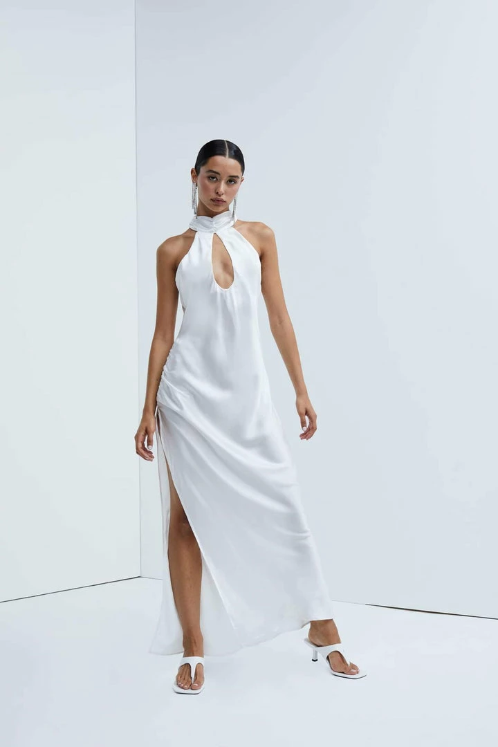 Slinky silky satin column dress featuring a high neck, sexy open back and gathered high slit. Keyhole at neckline, tonal buttons at back. Invisible zipper, partially lined.