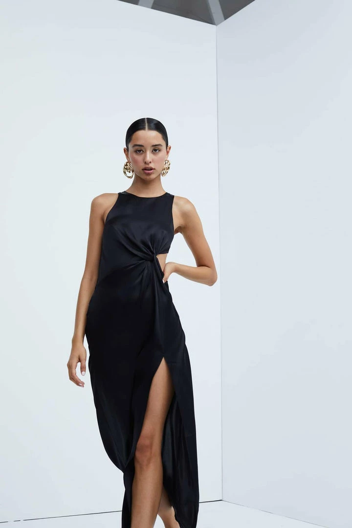 Slinky silky satin maxi dress featuring twist front detailing and sexy high slit. Open back with a draping at side. Tonal button closure at neck, invisible zipper, partially lined.