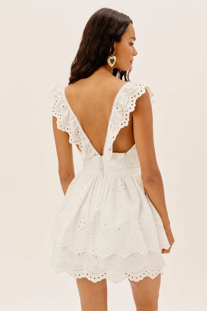 Lighthearted eyelet embroidered mini dress featuring sweet scallop embroidery, feminine pintucked waist, and a playful tiered skirt. Fully lined, fit and flare silhouette.