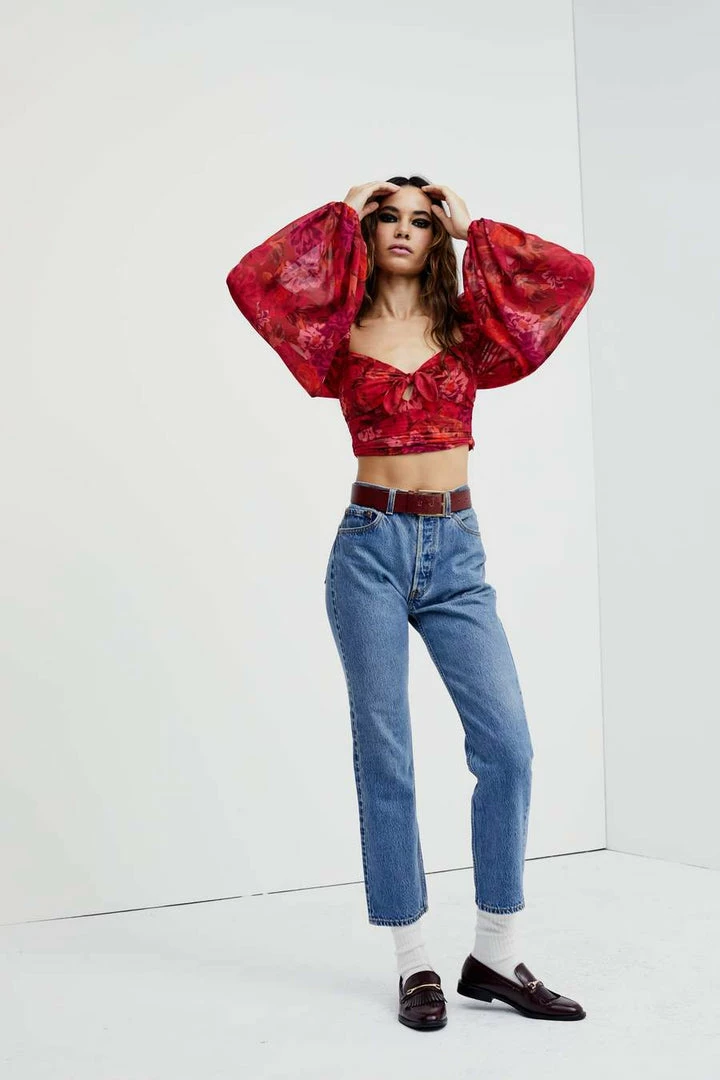 Romantic floral chiffon crop top featuring a delicate keyhole and billowing sleeves sleeves. Gathered at waist an invisible zipper at the side. Fully lined.