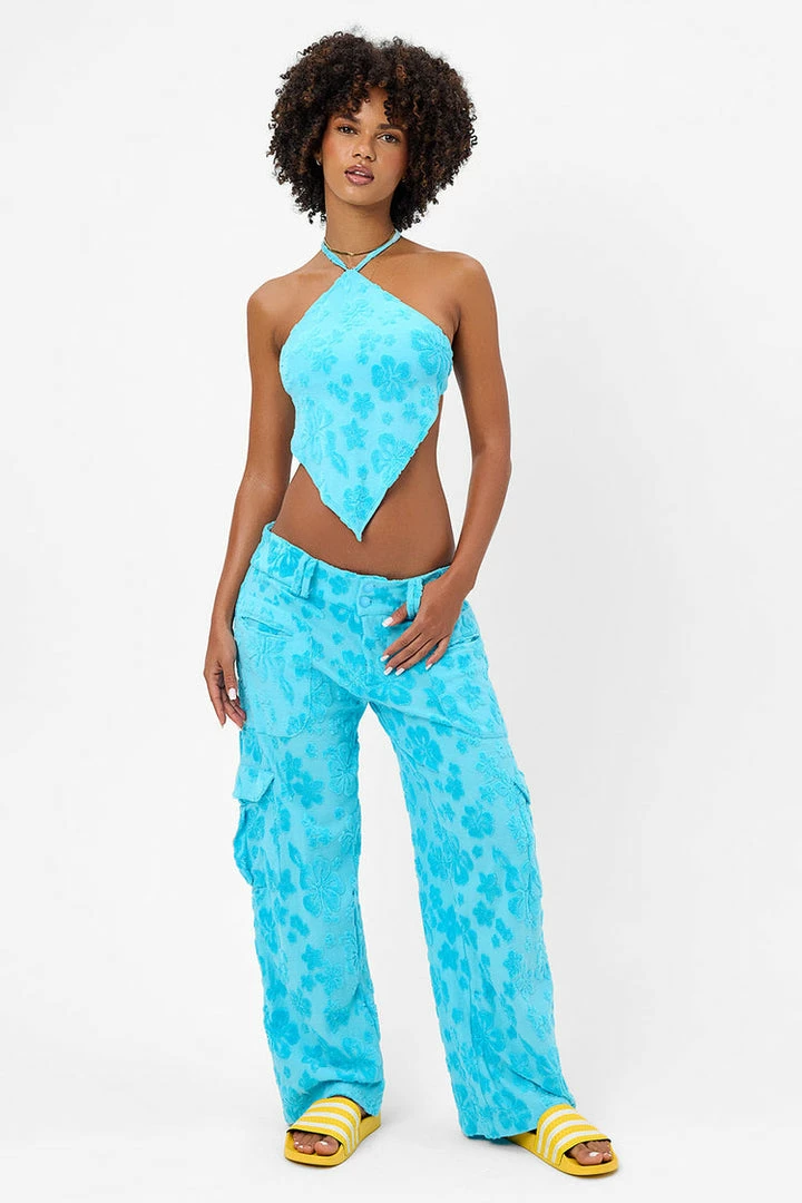So much newness and the Hennie top has us obsessed. This terry bikini top surely stands out on its own with its high-neck, bandana style design and sexy open tie back. Brought to you in Blue Isle, this terry bikini top is groundbreaking. Hennie will be a top contender this spring.