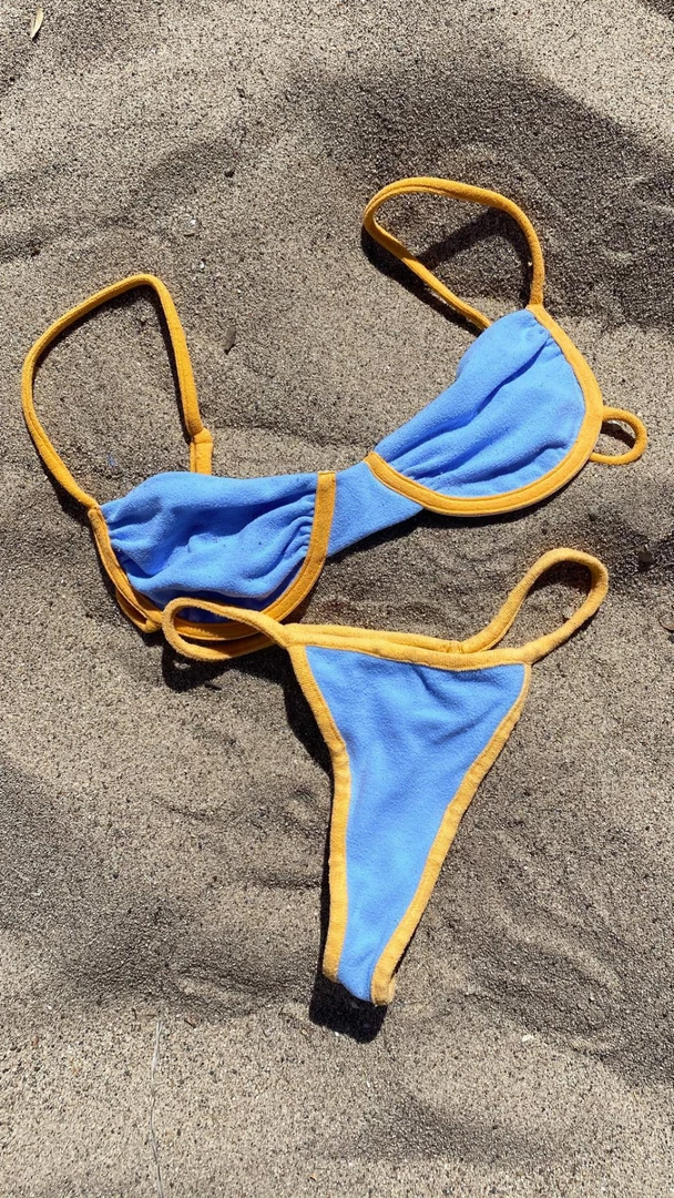 Say hi to Maggie. An underwire bikini top made to support and encourage you through it all. Designed with ruching throughout and thin adjustable straps. A dainty and simple bikini top that is effortlessly stylish and comfortable. We love her for her minimalist design and neon binding details, the perfect terry bikini.