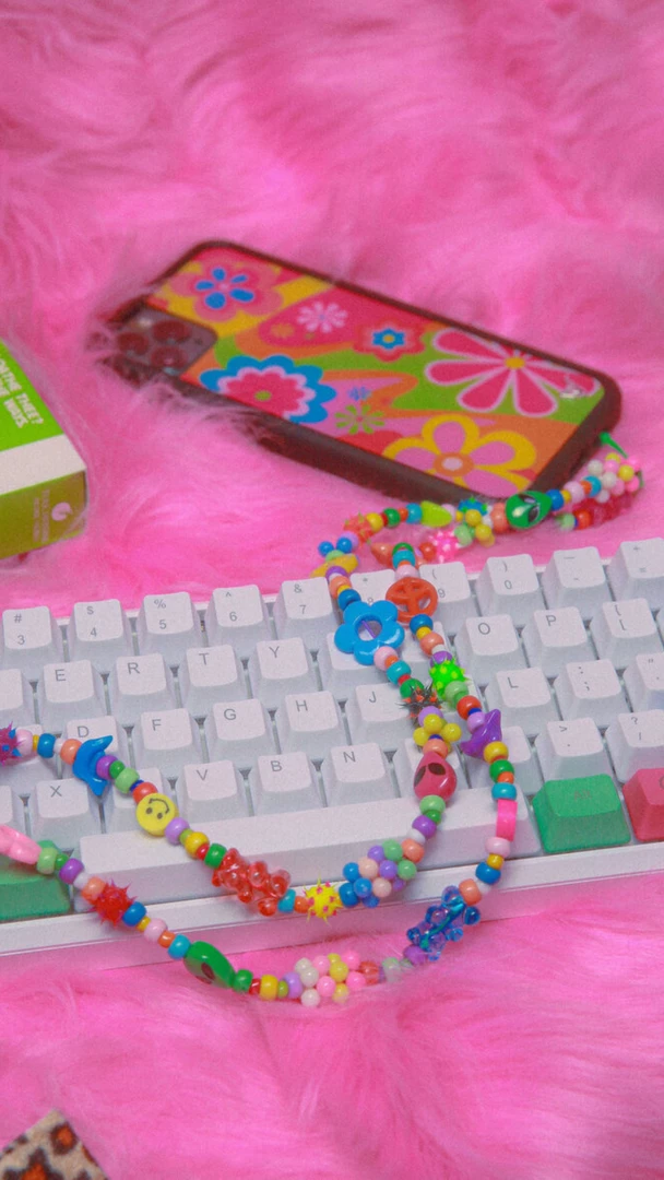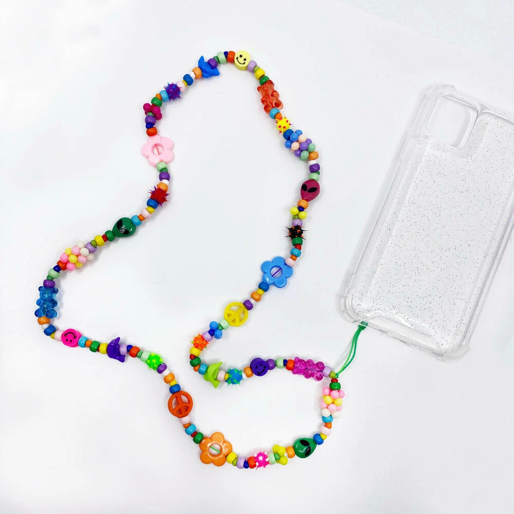 - Beads are a combination of plastic, rubber, glass beads, and variegated rainbow thread.