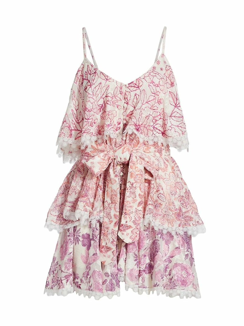This minidress is made of tiered fabric with a floral print, featuring a removable bow tie at the waist.