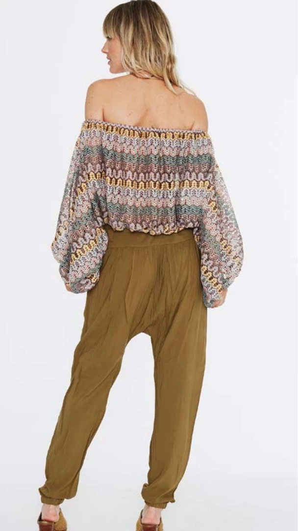 Off-the-shoulder top boasts an eye-catching pattern throughout.