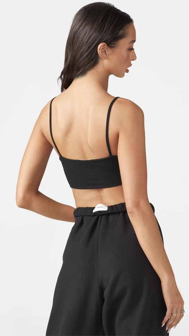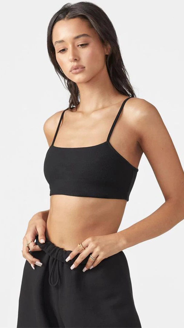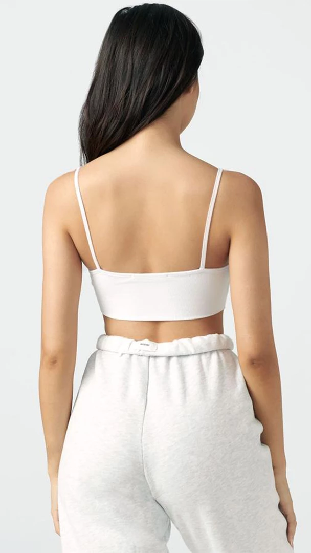 Fitted crop tank bra with a square neckline and thin straps. Feel a subtle pop of texture in this tight knit ribbed fabric. It’s stretchy, comfortable and forms perfectly to your body.