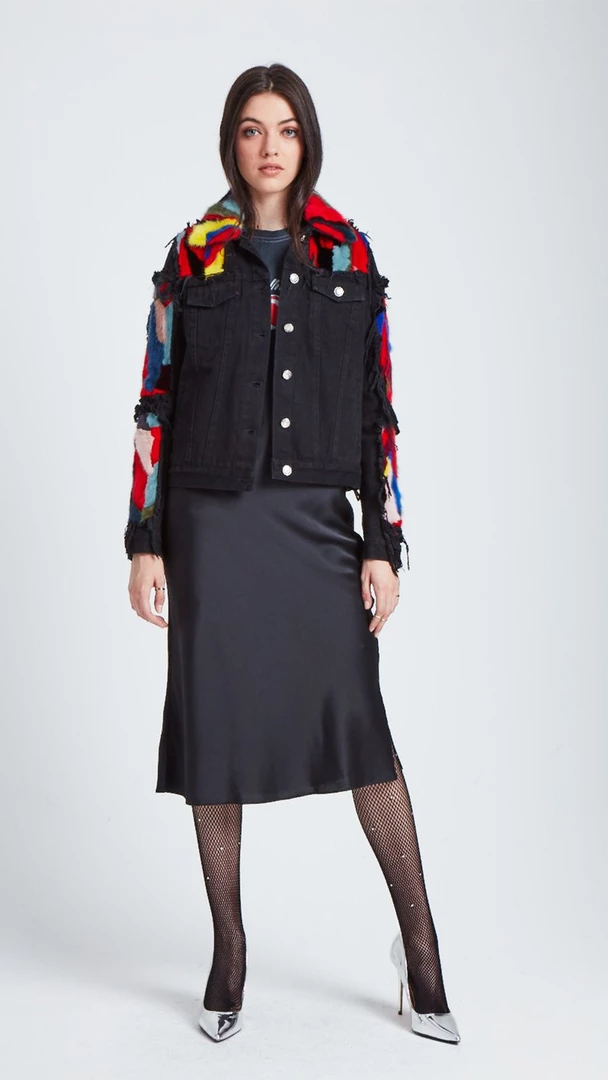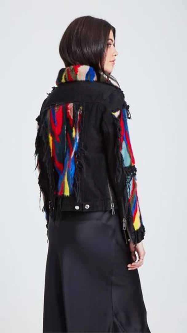 The Voyager Denim Jacket with mink fur underlay takes the traditional denim jacket to the next level. The patches of mink fur on the sleeves and mink collar make this jacket eclectic and unique!