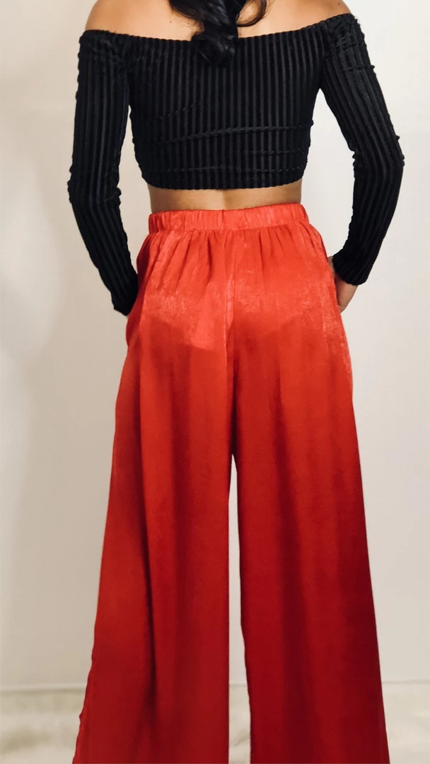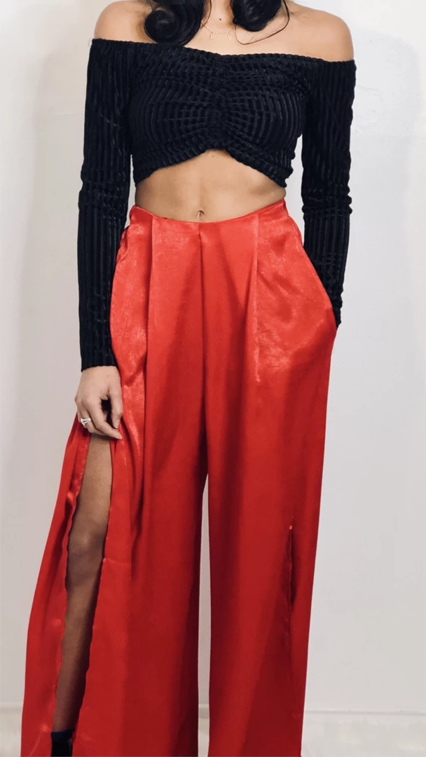 Red silk high-waisted palazzo pants, with slits on both sides. Pair with a cropped top for a statuesque look.