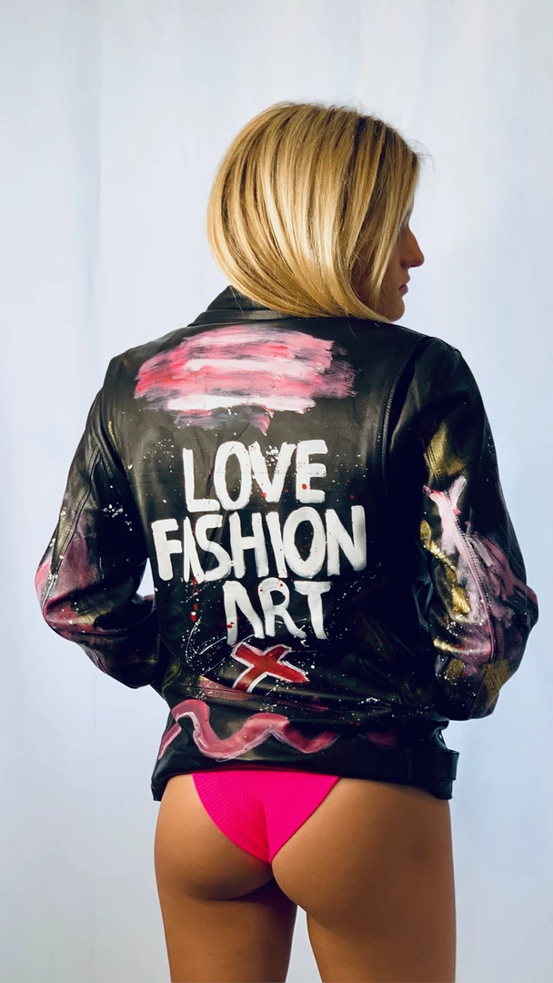 This amazing one-of-a-kind Black Leather jacket was designed by Love Fashion Art Showroom hand painted by Artist .