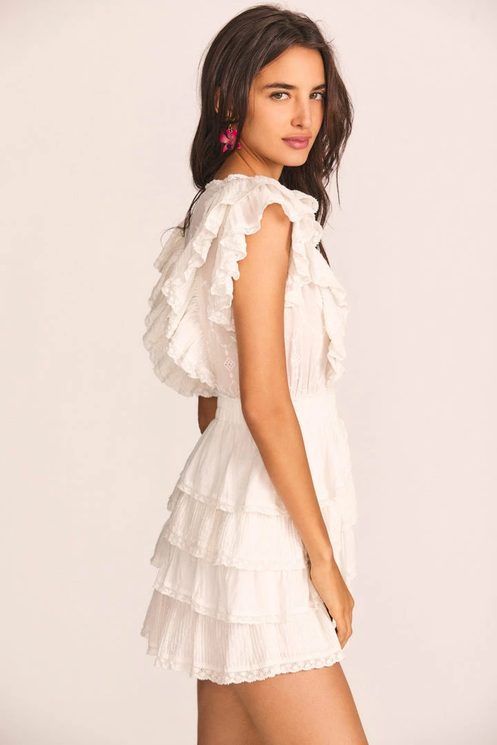 Meet our new Corelli Dress, an update to our iconic Natasha. This cotton voile minidress features schiffli embroidery, pintucking and a mix of custom laces. The v-neck is framed by overlapping ruffles that taper down the princess seams, forming flutter sleeves. Below a shirred elastic waist, the shirt falls to asymmetrical overlapping petal flounces. Accessorize this with our Lorna Barrette. Shown here in True White.