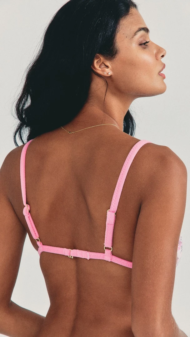 Take a dip in our LSF x Hurley Triangle Bikini Top, sweet in reversible terry cotton with a garden floral print on one side. This classic piece offers light compression support with adjustable straps, a hook closure at back and a decorative embroidered stitch detail that runs at a diagonal across each triangle at the bust.