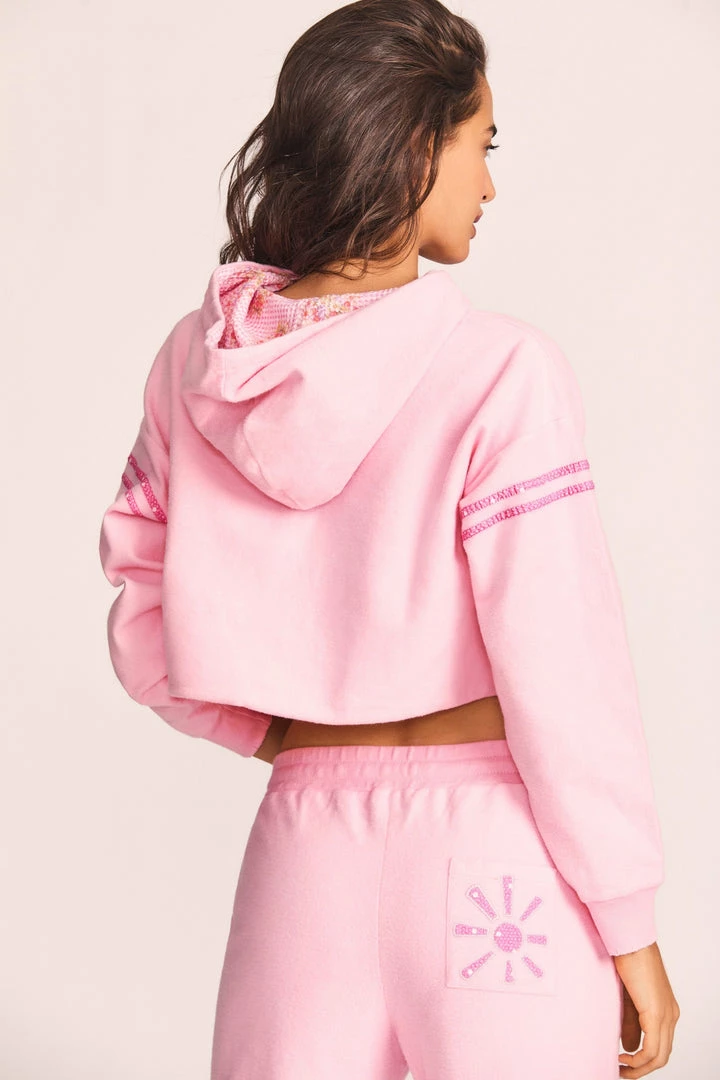 Get schooled in our Mercury Crop Hoodie, part of our inaugural LoveShack University Collection. A perfect grad gift, this terry sweatshirt’s hood is lined with a picnic print, mirrored at the drawcords. Polkadot lettering at center front is top-applied above a raw bottom hem. Drop-shoulder sleeves have stripe details and distressed cuffs at opening. Wear it as a set with our Barrett Sweatpant. Shown here in Candy Pink.