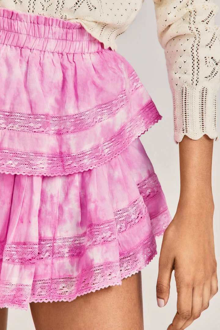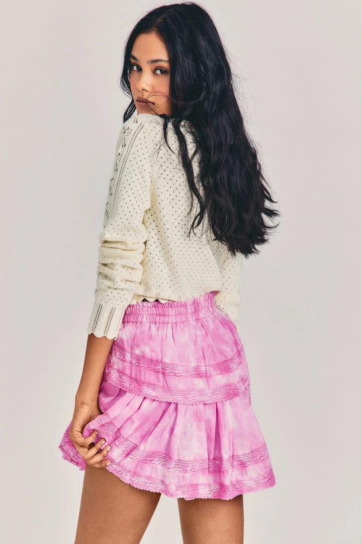 Our LoveShackFancy signature Ruffle Mini Skirt is got an update in hand-dyed cotton with inset floral lace and dot embroidery. The two-tiered short skirt—with elasticated waistband and shirred flounces—dances along with you as you move throughout the world. Pair it with our Ronda Top. Shown here in Washed Denim Hand Dye.