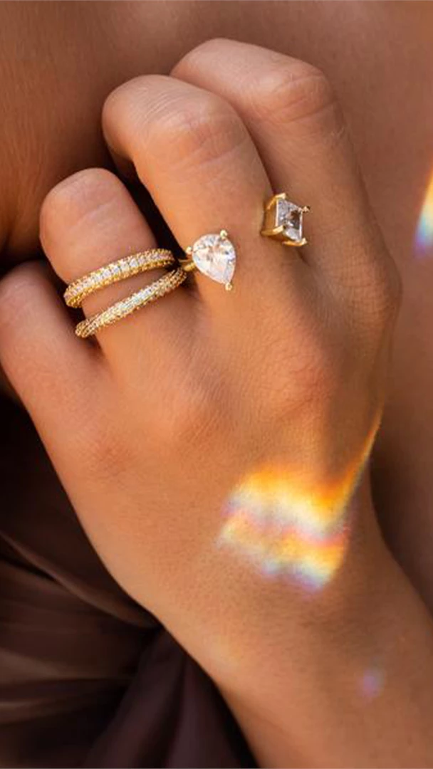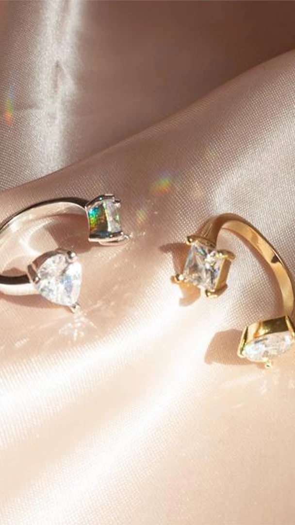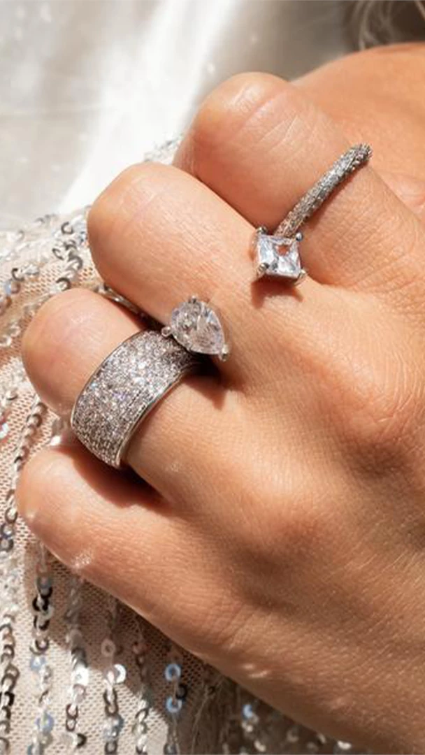 - Open front statement ring with princess + pear-cut CZ stones