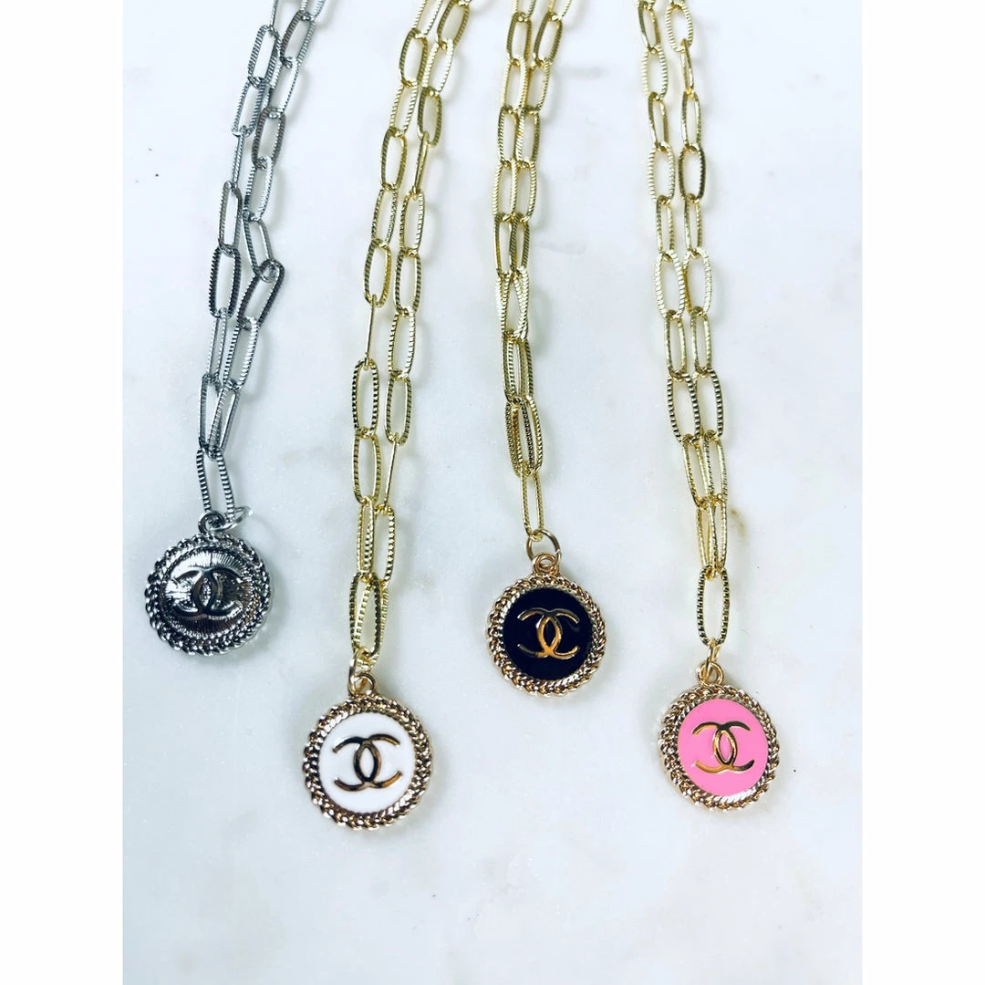 Authentic Chanel buttons repurposed into necklaces.