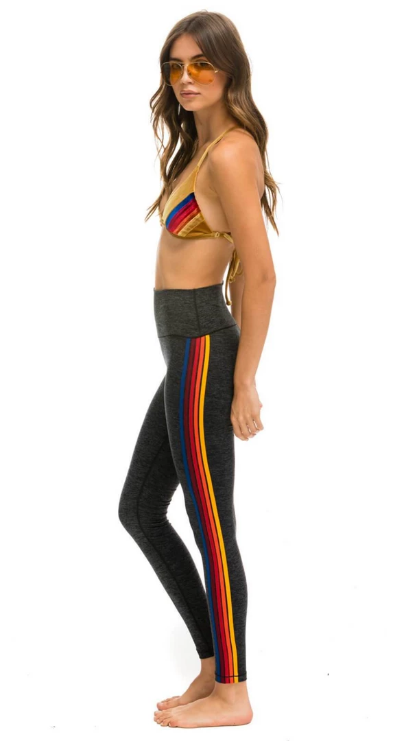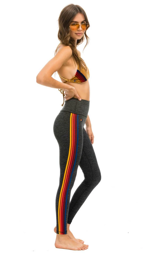 Our new high-rise fit is intended to sit high to give you the added coverage in the front and back for all your workout moves! These are designed for training. This fabric was made to be tough and built for a high tolerance to resist snags and abrasion. Fast drying and moisture wicking fabric that is highly breathable and has a four-way stretch. True to the Aviator Nation brand these leggings are all made here in California.