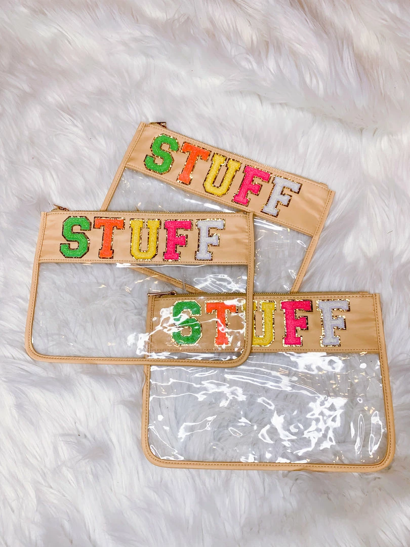 Easy access to whatever it is you are needing – this clear pouch is perfect. Airport checks, beach trips, travel totes, kids bags, and so many other reasons the clear pouch will make things so much easier! Who doesn’t like easy? Flat, clear nylon pouch with gold hardware. 8” x 11.5”