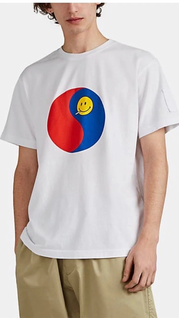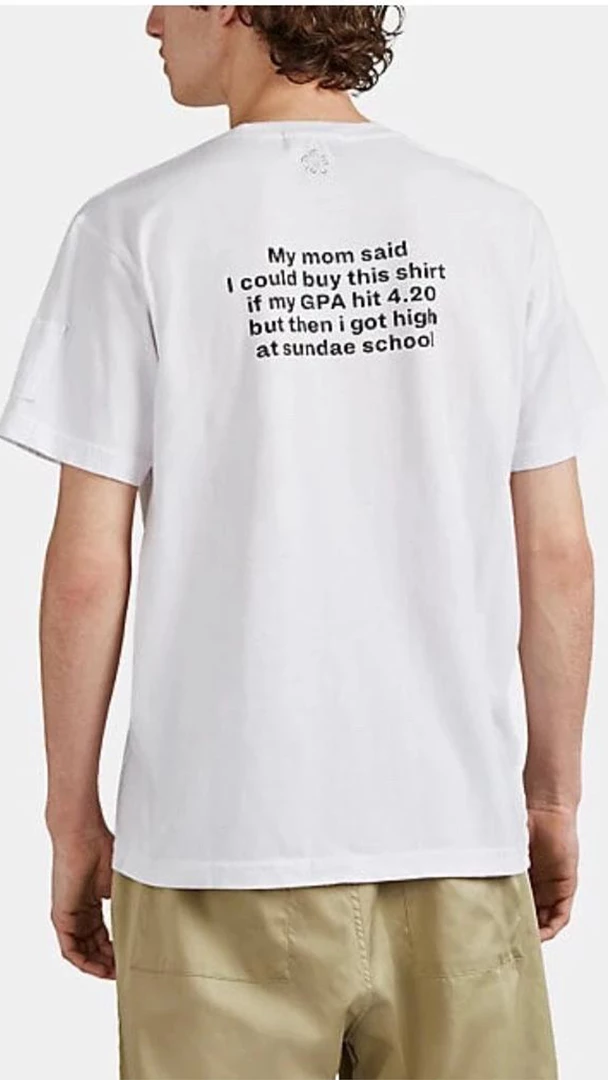 Sundae School’s white cotton jersey T-shirt is printed at the front with a red and blue Taegeuk graphic, found on the South Korean flag, paired with a playful yellow smiley face. The Seoul-based label prints this humor-infused style at the back with black “My Mom Said I Could Buy This Shirt If My GPA Hit 4.20” lettering.
