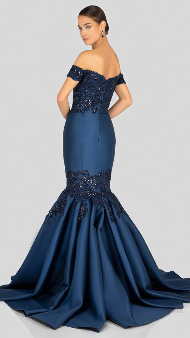 Make a statement as you strut in this long dress from Terani Couture 1911E9622. Fashions an off the shoulder neckline with a sweetheart notch. The bust, sleeves, and full-length mermaid skirt is adorned with glittering embellishments. The back has a zipper closure and brings drama with a sweep train finish. Feel gorgeous when you walk into the party wearing this Terani Couture masterpiece.