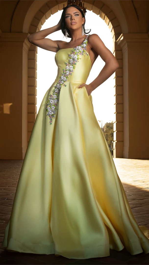 Look exquisite in this incomparable gown from Terani Couture 2017P1421. The fitted bodice features a straight across neckline, mirrored with a mid-open zipped up back. Beautiful floral appliques design the single shoulder strap as it trails down the upper skirt adorned with soft pleats and side pockets. The skirt parades a ballgown silhouette that falls to a full length hemline. You are picture of perfection in this Terani Couture ensemble. Model is wearing Yellow color. Perfect for prom or bridesmaid dress.