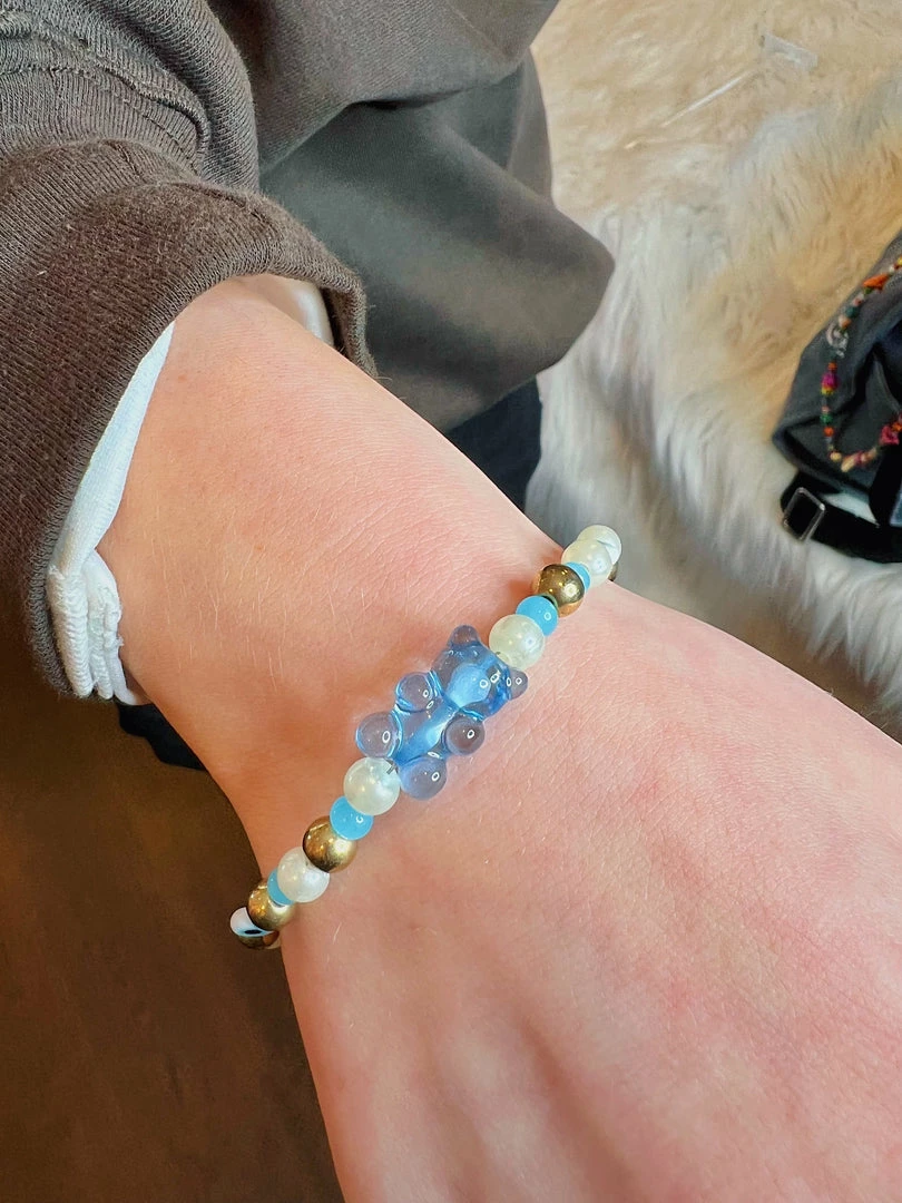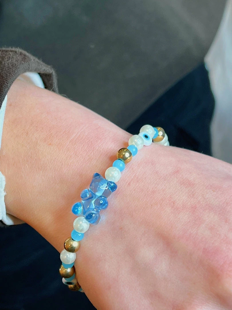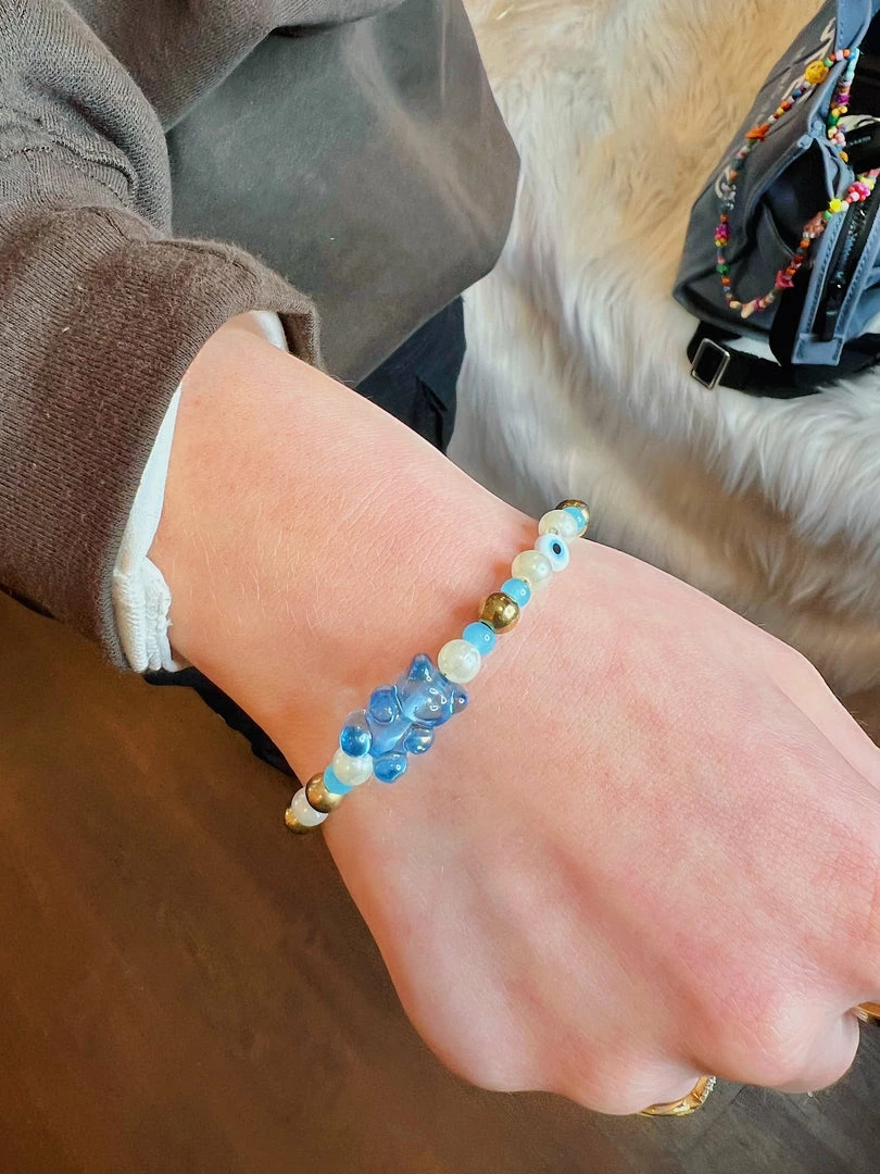 Meet the Blue Bear bracelet! This one of a kind bracelet is made with acrylic pearls, gold balls, evil eyes, and an adorable gummy bear in its center.