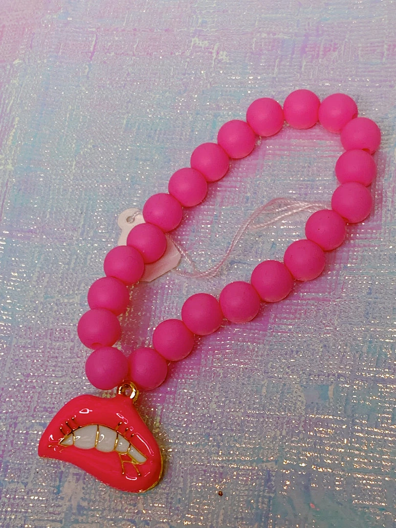 This friendship bracelet is made with the softest beads and finished off with a hot pink lip charm.