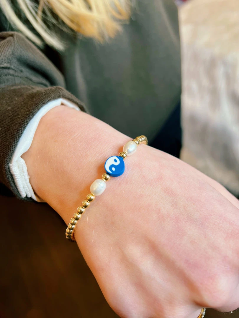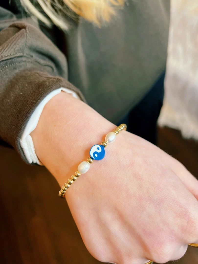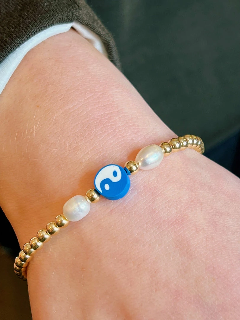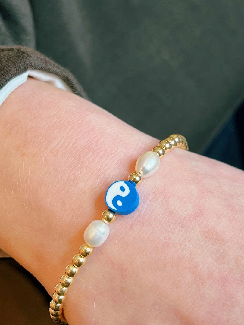 The Salty Bracelet is made out of fresh saltwater pearls, gold filled balls, and a blue polymer yin yang to add more of an ocean-esque vibe.