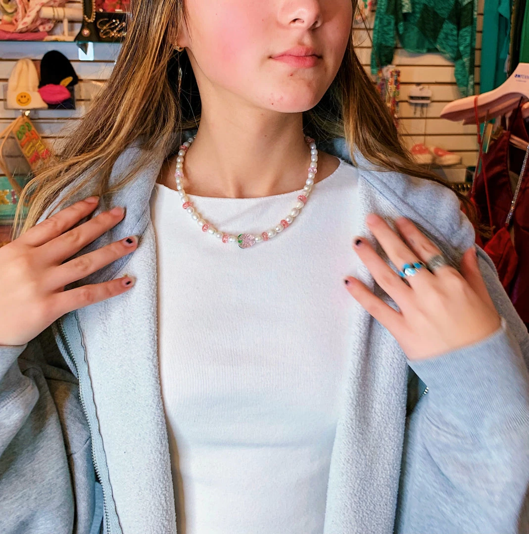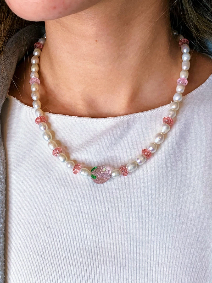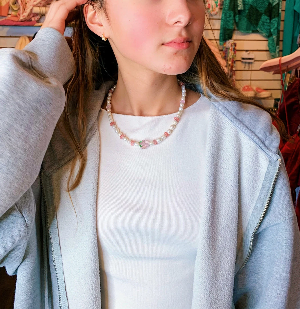 Add this adorable necklace to your collection, which features fresh water pearls and a handmade Strawberry glass bead.