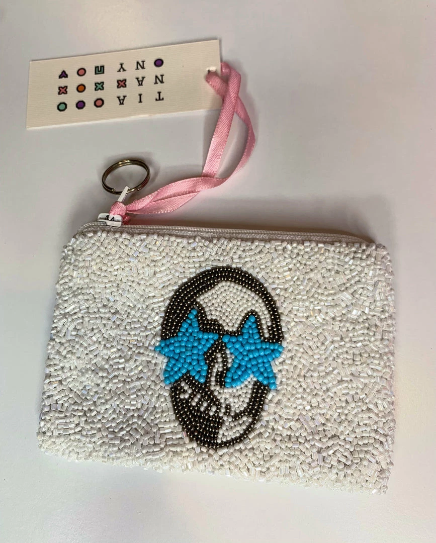 This hand beaded pouch is perfect for storing your coins, lip gloss, and whatever else you carry on the move! A plus is that you can also attach it to your keys.