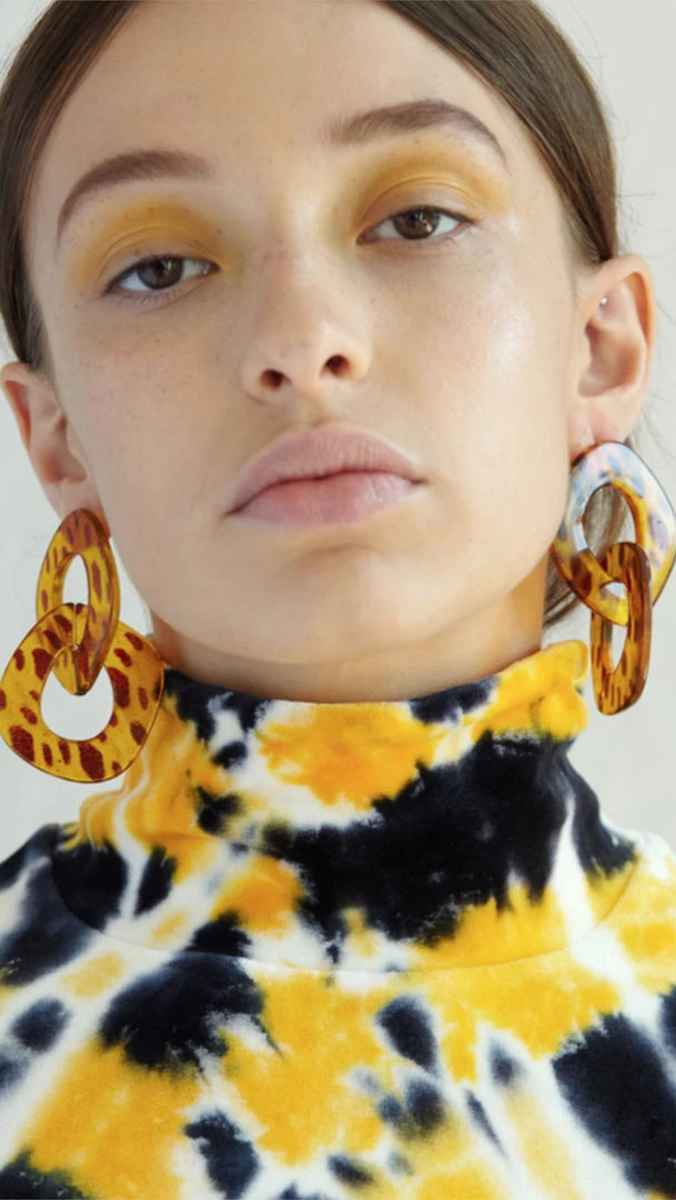 Valet’s ‘Andrea’ earrings feature an interlinked double hoop silhouette in lightweight resin.