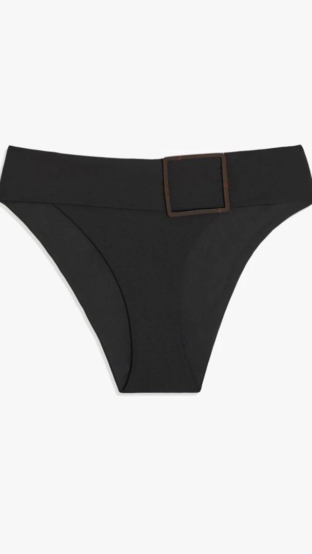 Featuring a wide waist belt and tortoise buckle, the Annie bottom creates the illusion of fuller hips, making it especially suited to straighter figures. The low rise and moderate back coverage enhance the curve-flattering effect.